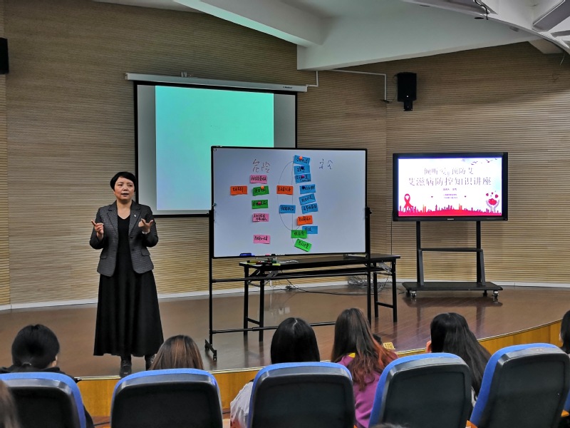 首先,王芳老师向在场的同学们简单介绍了艾滋病的概念以及传播途径,并带领同学进行有趣的头脑风暴,寻找可能传染AIDS的原因。随后,通过“如何正确看待艾滋病”、“判断安全与高危行行为”等小游戏帮助同学们进一步了解艾滋病的预防。在提问环节,王芳老师通过“爱”抛砖引玉提问同学们对于“青春健康”的看法,引导同学们共同探讨了360度的青春,并且鼓励在与异性交往过程中要注重自己的意愿,勇敢直接的表达自己的客观感受,让在场同学受益匪浅。
