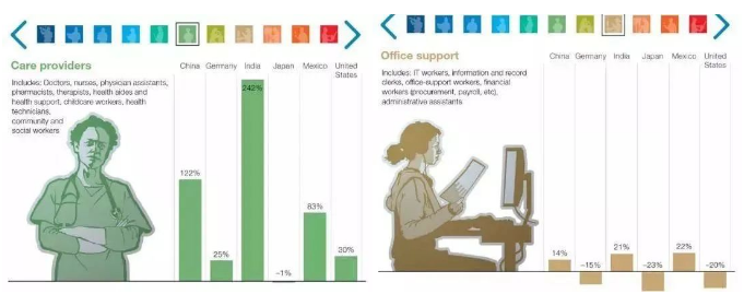 麦肯锡报告中分了11个行业大类,看不同国家未来在这些行业的岗位需求变化。其中涉及到创意工作、技术类工程师、管理类以及社会互动类的岗位需求增长明显,因为机器还无法在这些领域取代人类。另一方面,那些在可预测环境中进行物理活动的部分岗位需求将下降明显。