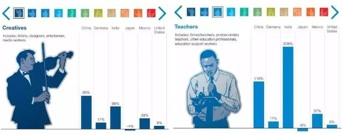 在创意人员(艺术家、设计师、娱乐业从业者、媒体工作者)大类中,中国岗位需求将增长85%;